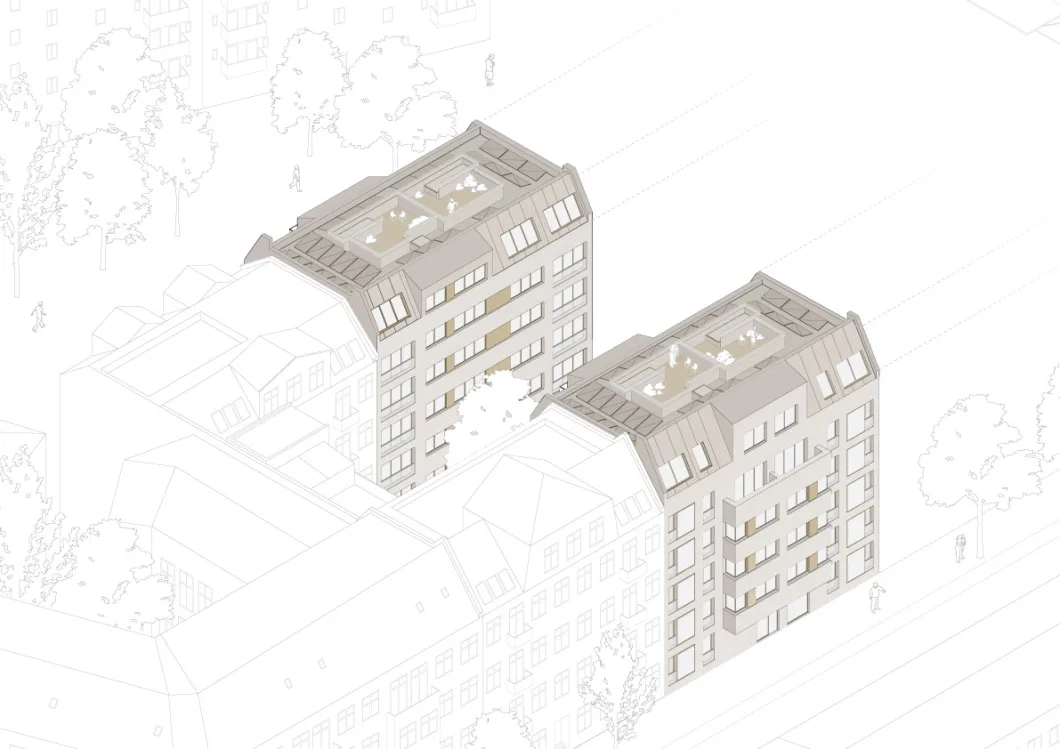 Das Projekt in der Herthastraße besteht aus zwei sechsgeschossigen Gebäuden (Vorder- und Gartenhaus) mit insgesamt 35 Wohnungen. Entsprechend der planungsrechtlichen Gegebenheiten fügen sich die beiden neuen Volumen in die Logik eines bestehenden, berlintypischen Gründerzeitblocks ein.